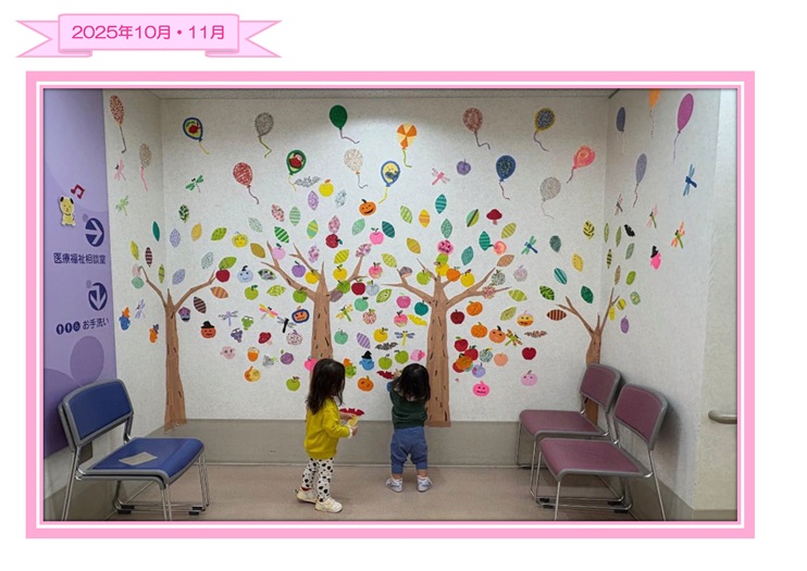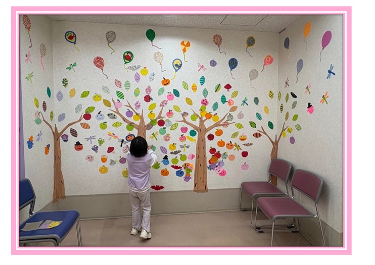 小児科外来の白い壁に、子どもたちがマスキングテープで作ったカボチャやオバケを貼ってくれました。 待ち時間も楽しく過ごせる、にぎやかな空間になっています。 次は『クリスマス』です。